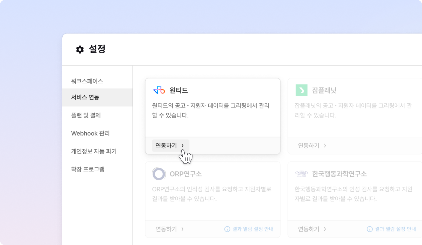 설정 > 서비스 연동 페이지에 접속하여, 원티드 [연동하기] 버튼을 클릭 후 원티드에서 발급받은 코드를 입력해 주세요.