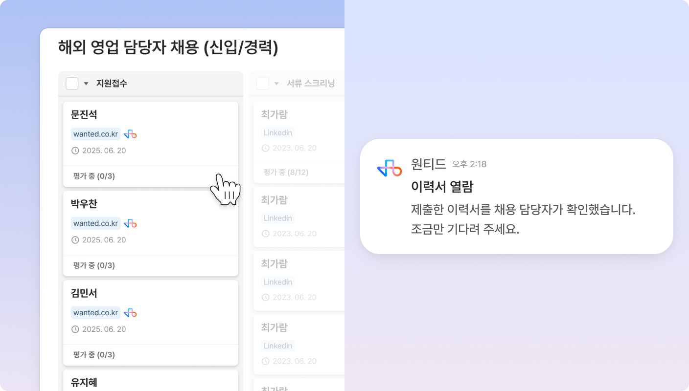 그리팅 내 지원자 상태 변경 시, 원티드에 자동으로 반영돼요.