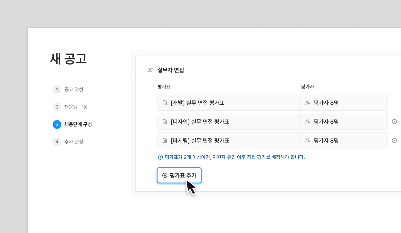 채용 단계별로 최대 20개의 평가표, 평가자 세트를 구성할 수 있습니다.