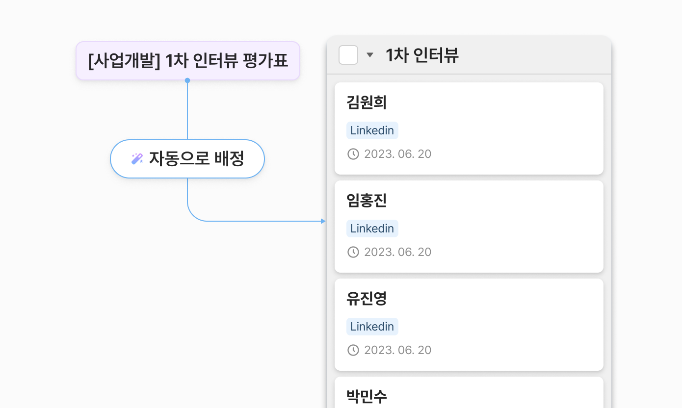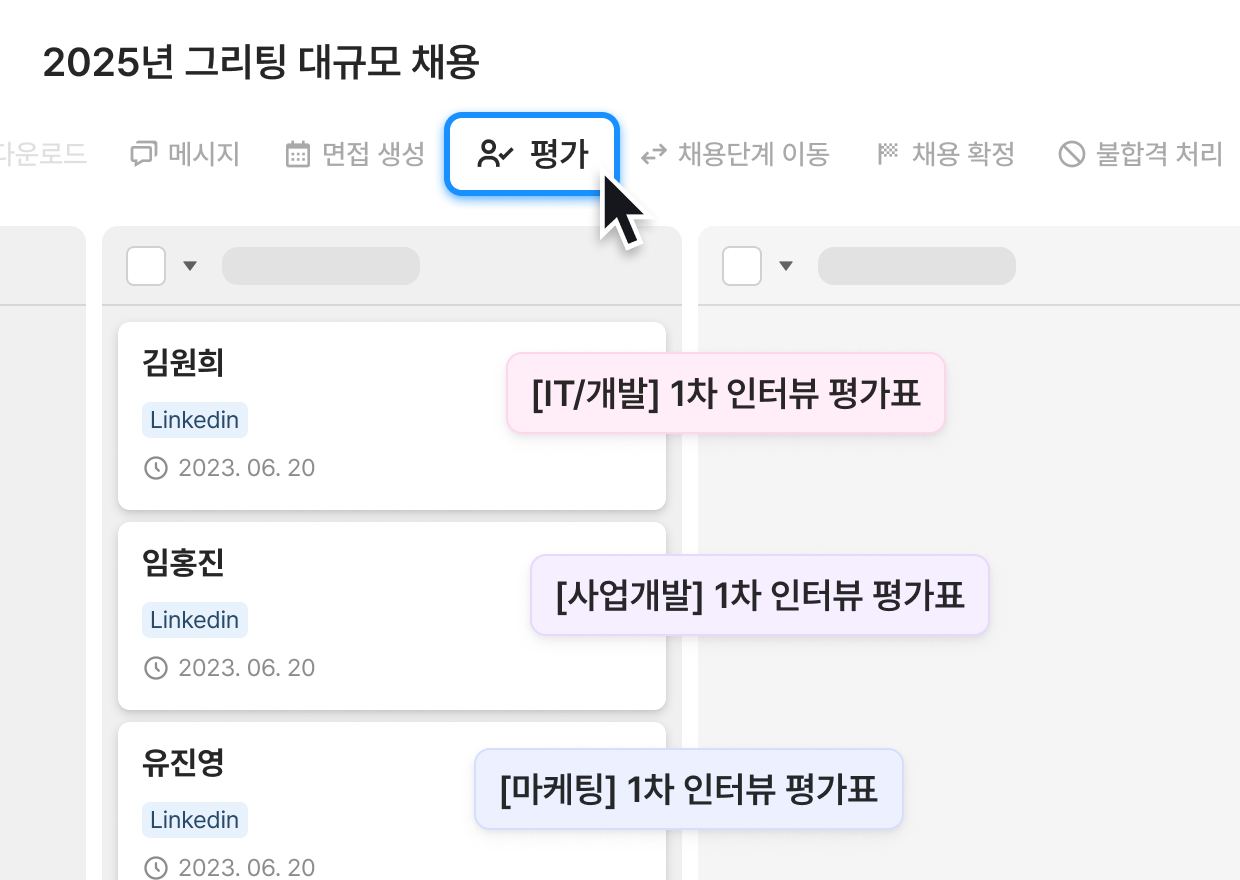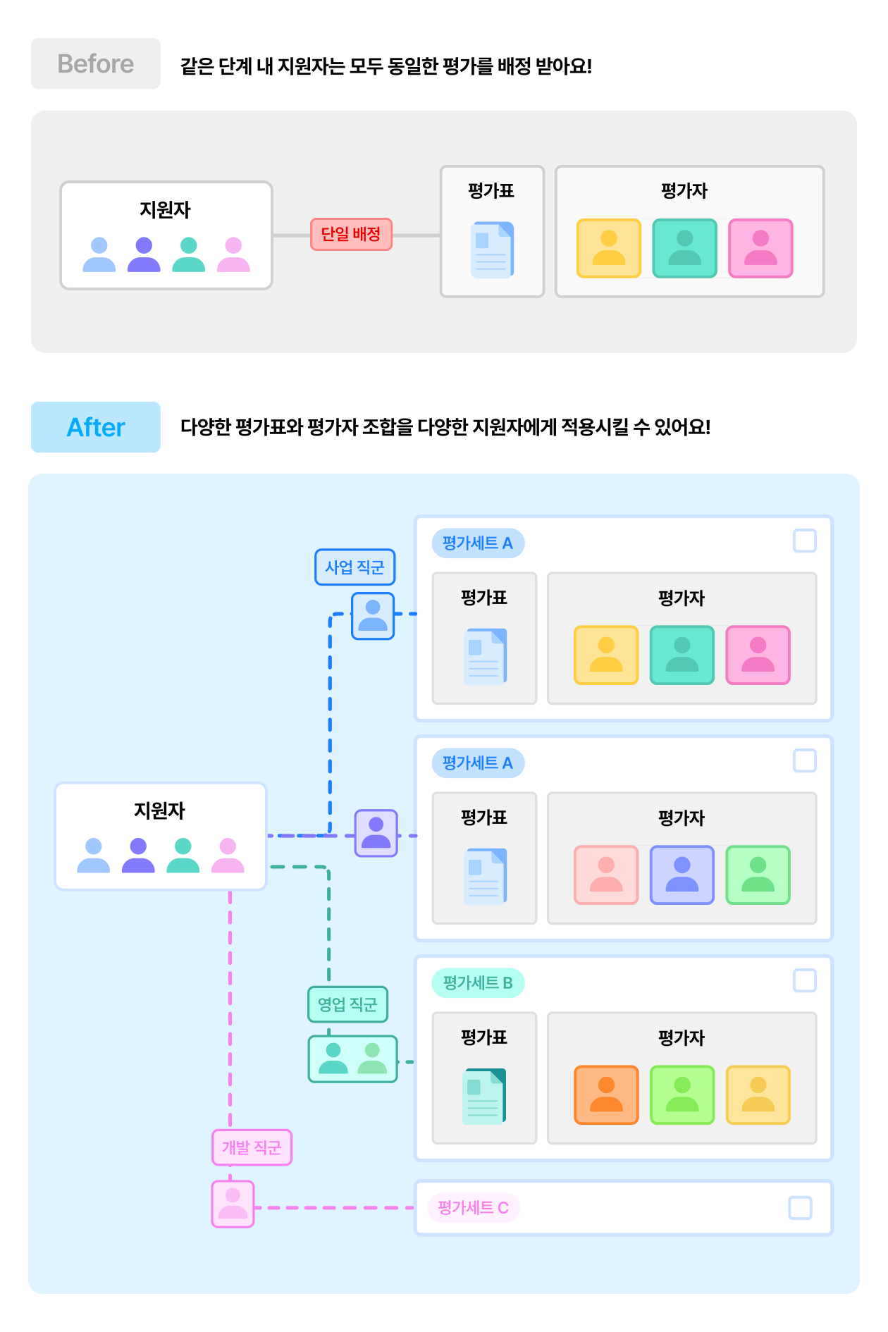 같은 채용 단계 내 지원자라면 동일 평가를 배정받는구조에서, 같은 채용 단계 내 지원자에게 서로 다른 평가를 배정이 가능하도록 변경됩니다.