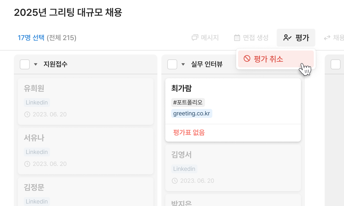 평가 취소가 완료되면, 해당 지원자는 평가가 배정되어 있지 않은 '평가표 없음' 상태로 초기화 됩니다.