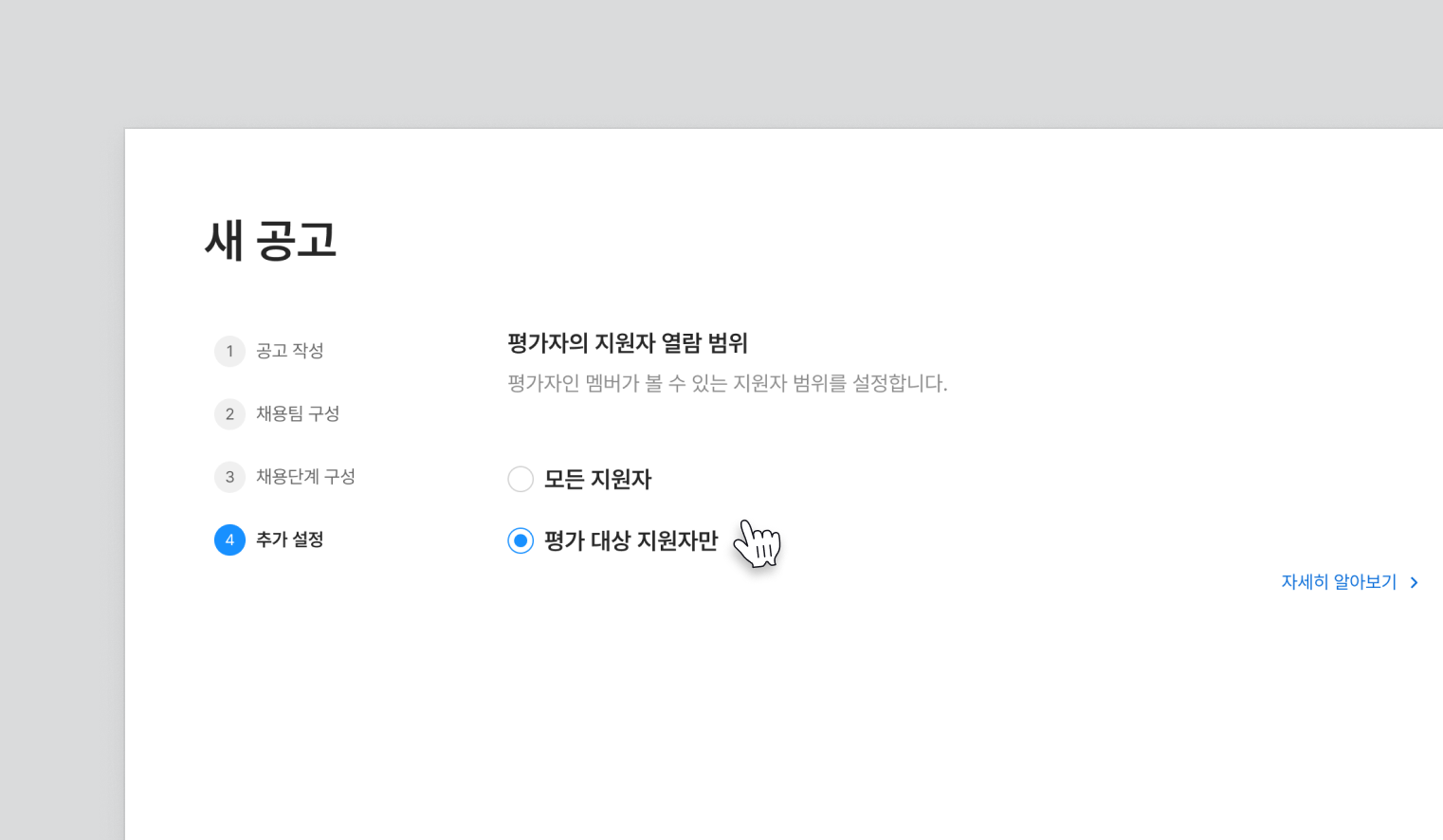 '채용담당자' 멤버는 해당 설정과 무관하게 모든 지원자와 평가 내용을 열람할 수 있습니다.