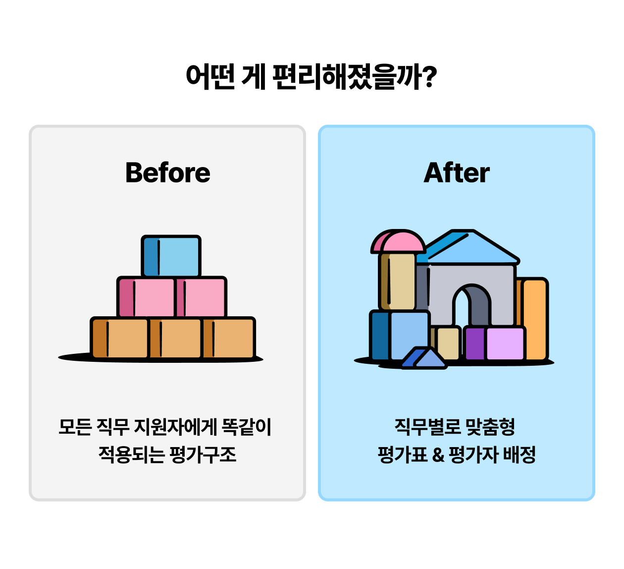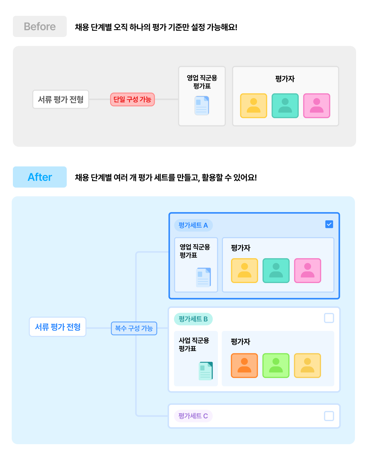 채용 단계별로 단일의 평가표, 평가자 그룹을 설정할 수 있던 방식에서, 채용 단계 내 복수 평가표, 평가자 세트 구성이 가능하도록 설정 방식이 변경됩니다.