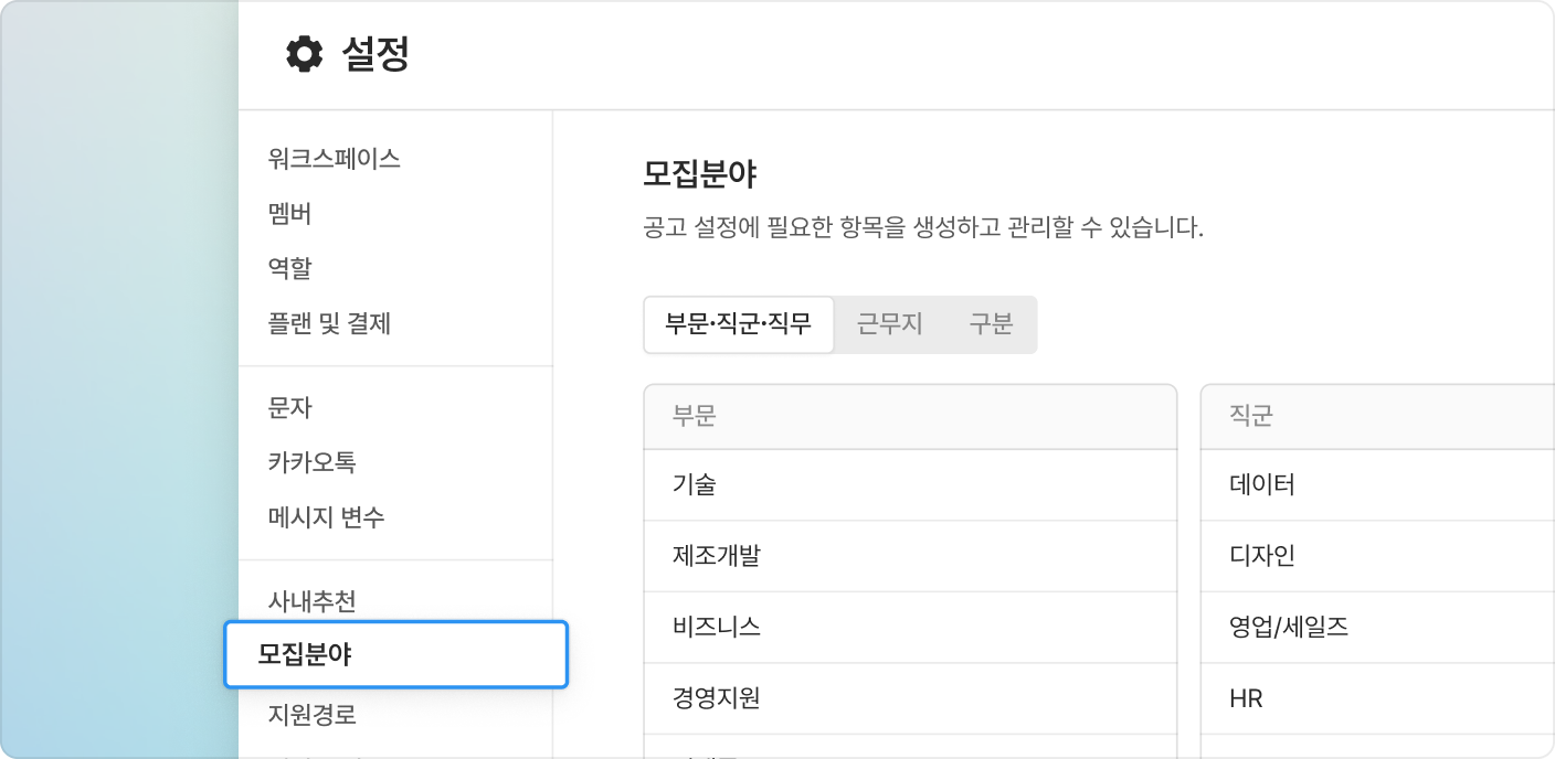 공고 등록 시 설정하는 모집분야(부문, 직군, 직무, 근무지, 구분) 정보는 워크스페이스 설정 메뉴에서 통합 관리 할 수 있어요.