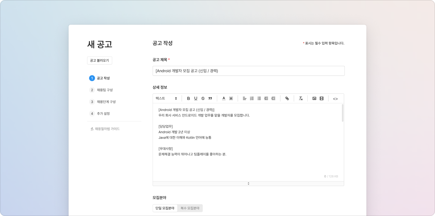 입력 흐름이 더 직관적이도록 ‘공고 제목 → 상세 설명 → 모집분야’ 순으로 개선되었습니다.
