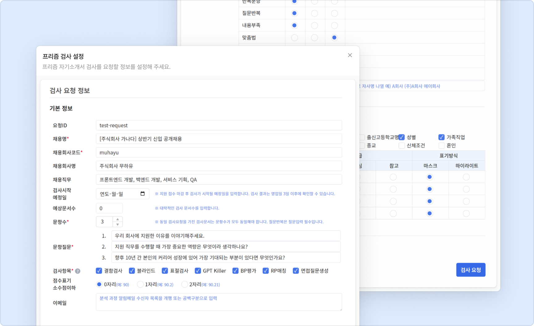 검사 설정 화면에서 자기소개서 검사, 면접질문생성 등 각 채용단계에서 필요한 검사 항목을 선택해서 요청해주세요.