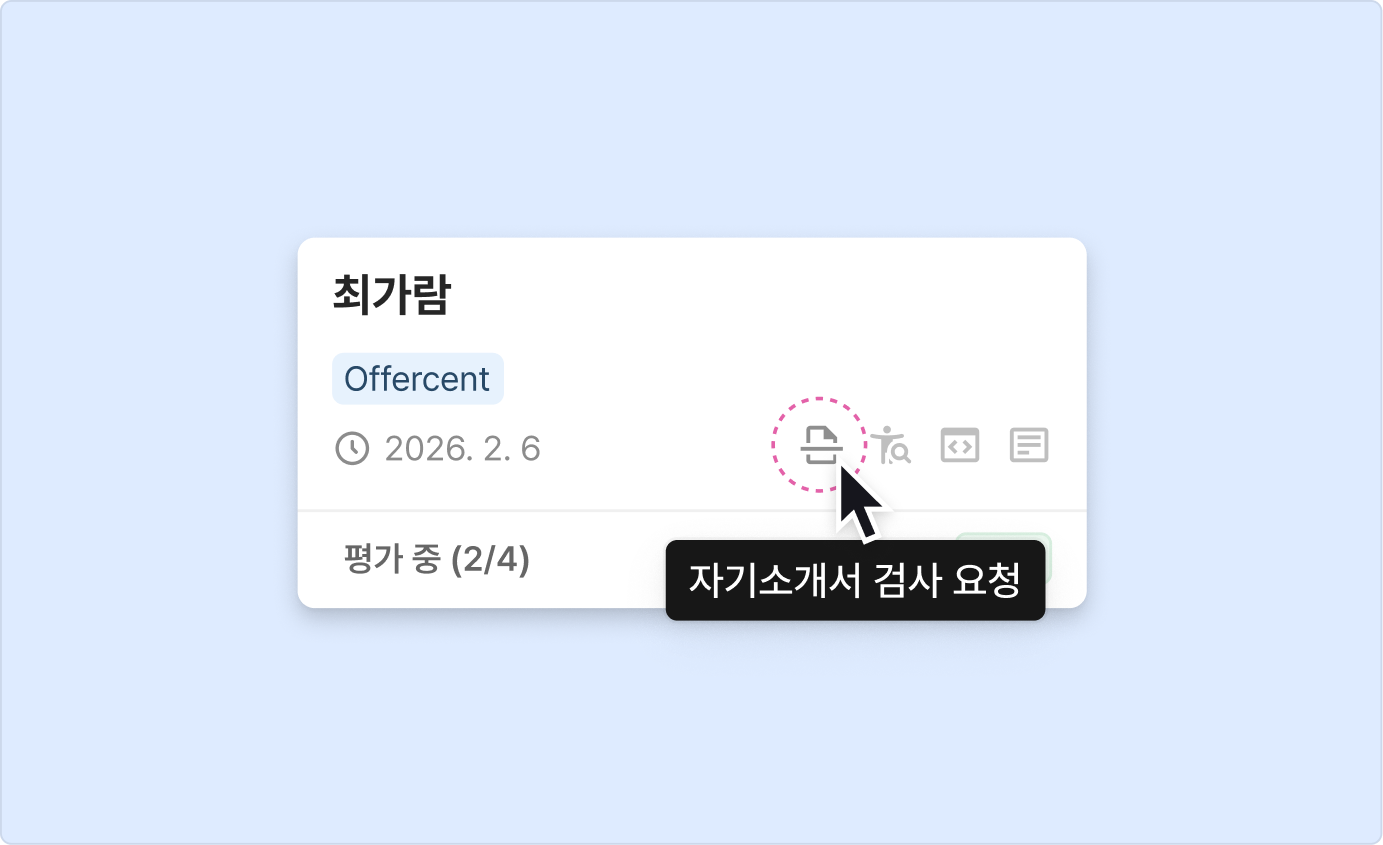 지원자 카드의 우측 하단에 표시되는 아이콘으로 검사 상태를 확인할 수 있습니다.