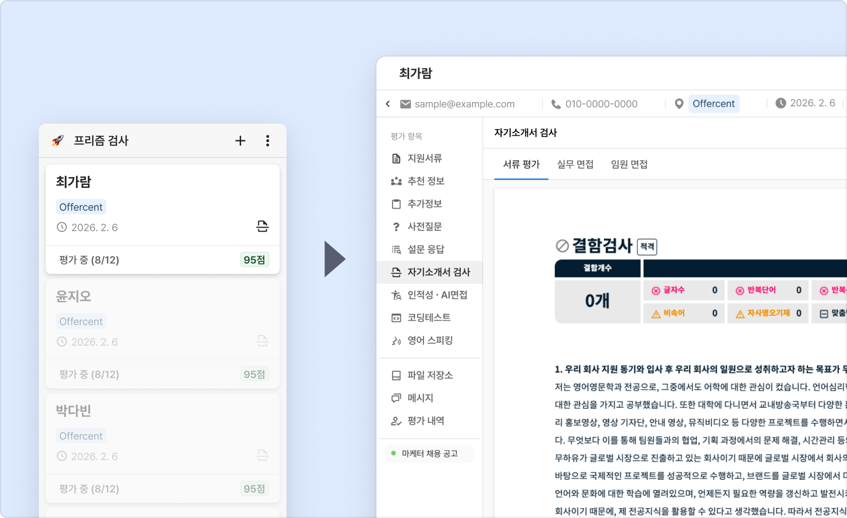 자기소개서 분석을 통해 기준 미달 서류를 필터링하고, 후보자 검증을 위한 맞춤 면접 질문을 생성할 수 있어요.