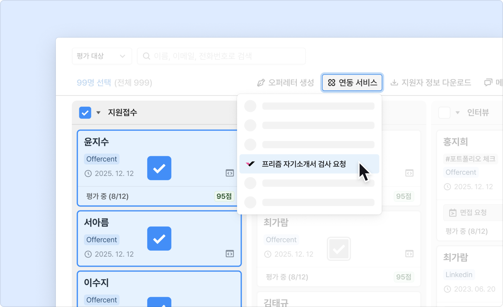 채용단계에 따라 여러번의 프리즘 검사를 요청할 수 있지만, 동일한 채용단계에서는 지원자당 한 번의 검사 요청만 가능합니다.