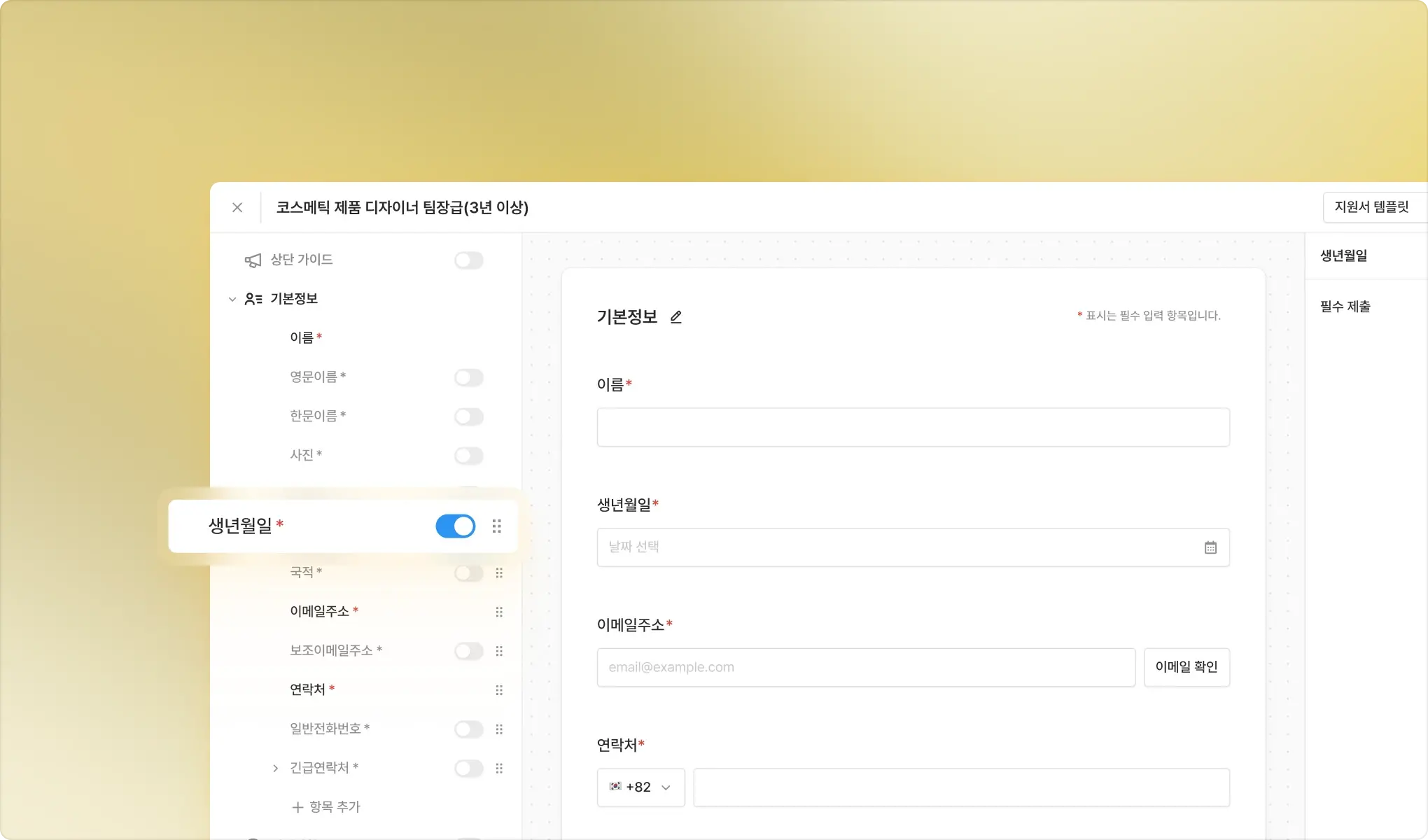 이제 공고의 성격에 맞춰 지원서의 모든 구성 요소를 직접 제어할 수 있습니다.