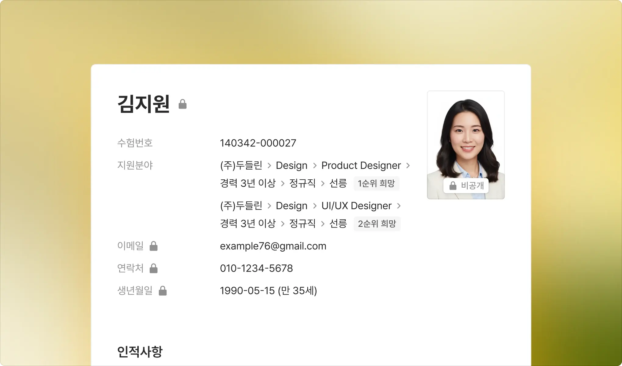 공정한 평가와 보안을 위한 ‘지원서 항목별 비공개 설정’지원자의 정보(이름, 사진, 학력, 연봉 등) 열람 권한을 역할마다 다르게 설정할 수 있습니다.