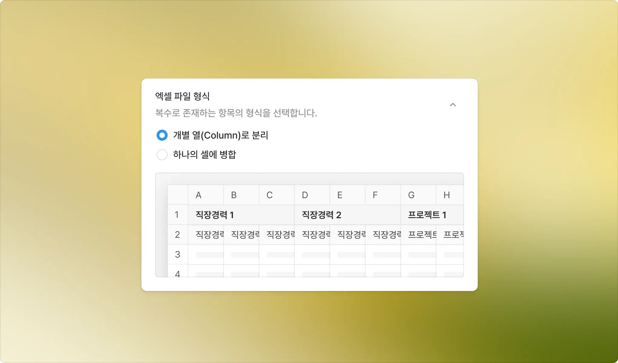 경력이나 학력 등 여러 개가 입력된 복수 항목을 셀 하나에 합칠지(병합형), 개별 열로 나열할지(기본형) 선택이 가능합니다.
