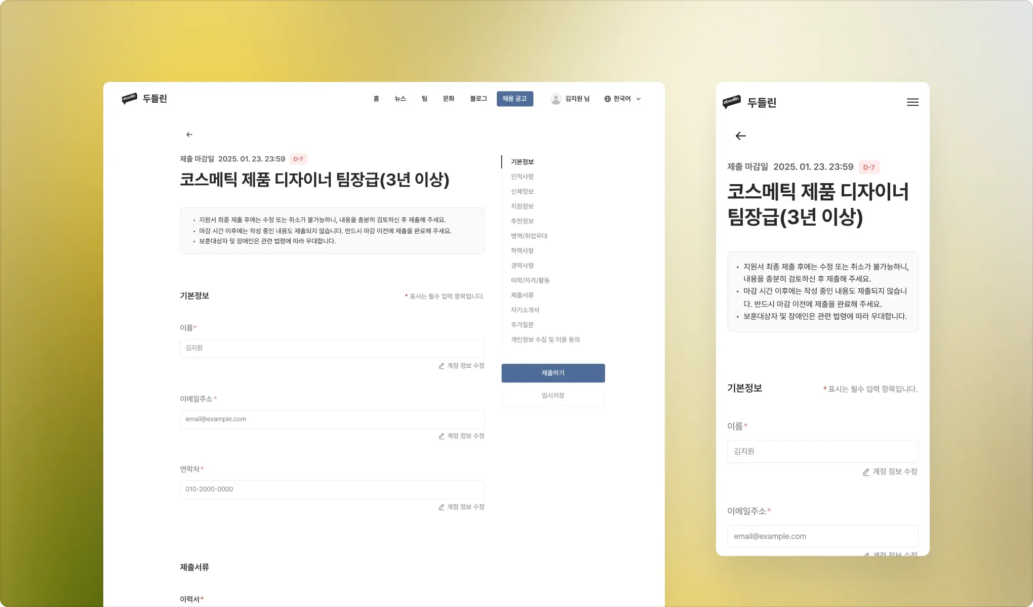 새롭게 설계된 지원서 항목들이 최적화된 레이아웃으로 노출되어, 모바일과 데스크탑 어디서든 쾌적한 작성이 가능합니다.