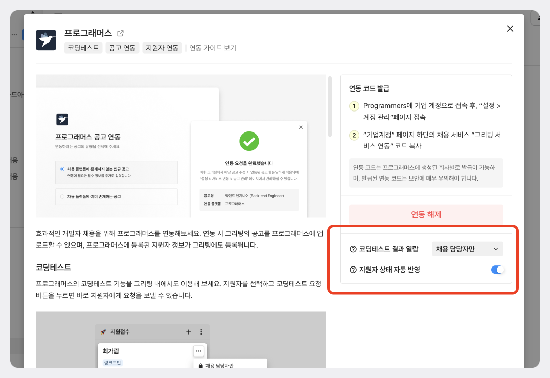 [설정] → [서비스 연동] → [프로그래머스]에서 발급받은 코드를 입력하여 완료합니다