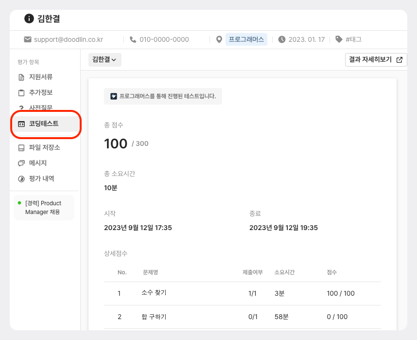 코딩 테스트에 대한 결과를 그리팅에서 쉽게 확인할 수 있습니다
