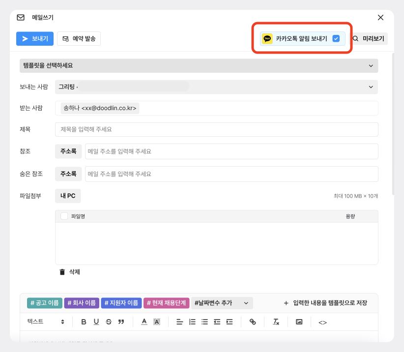 [카카오톡 알림 발송]을 보다 쉽게 설정할 수 있도록 메일 작성 화면으로 이동했습니다