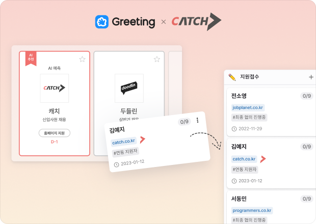 그리팅이 캐치 플랫폼과의 연동 기능을 출시했습니다. 이제 그리팅에서 캐치 플랫폼과 연동하여 그리팅 공고를 보다 쉽게 캐치 플랫폼에 업로드할 수 있습니다. 연동 기능 외에도 지원 서류를 링크로 제출 수 있는 지원 서류 링크 제출 기능 및 다양한 Forms 추가 편의 기능을 만나보세요.