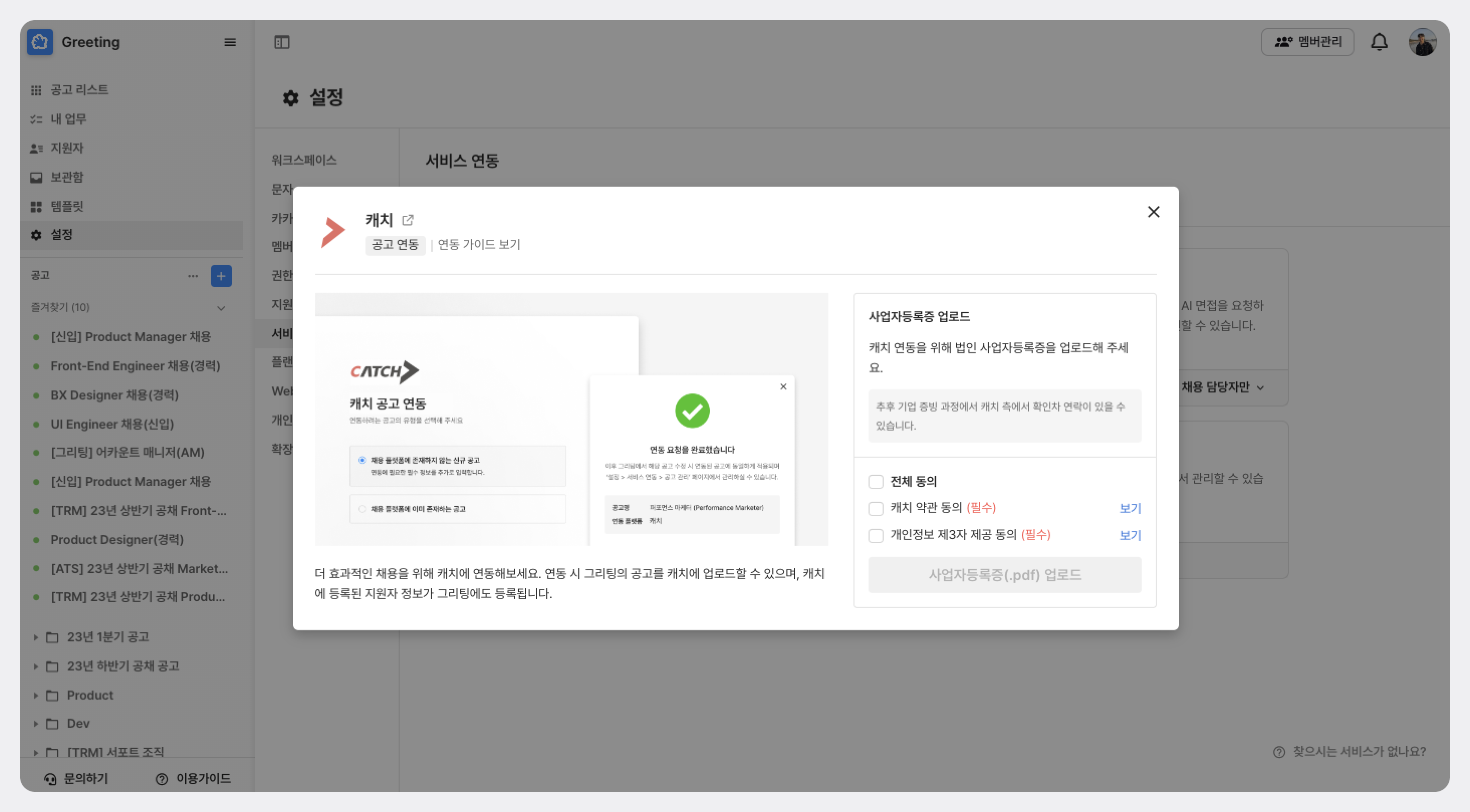 캐치 플랫폼 연동 기능을 활용하여 그리팅 공고를 쉽게 캐치 플랫폼에 업로드하여 공고를 관리할 수 있습니다. 캐치 플랫폼에 그리팅 공고를 업로드하여 더 많은 지원자를 확보해 보세요.