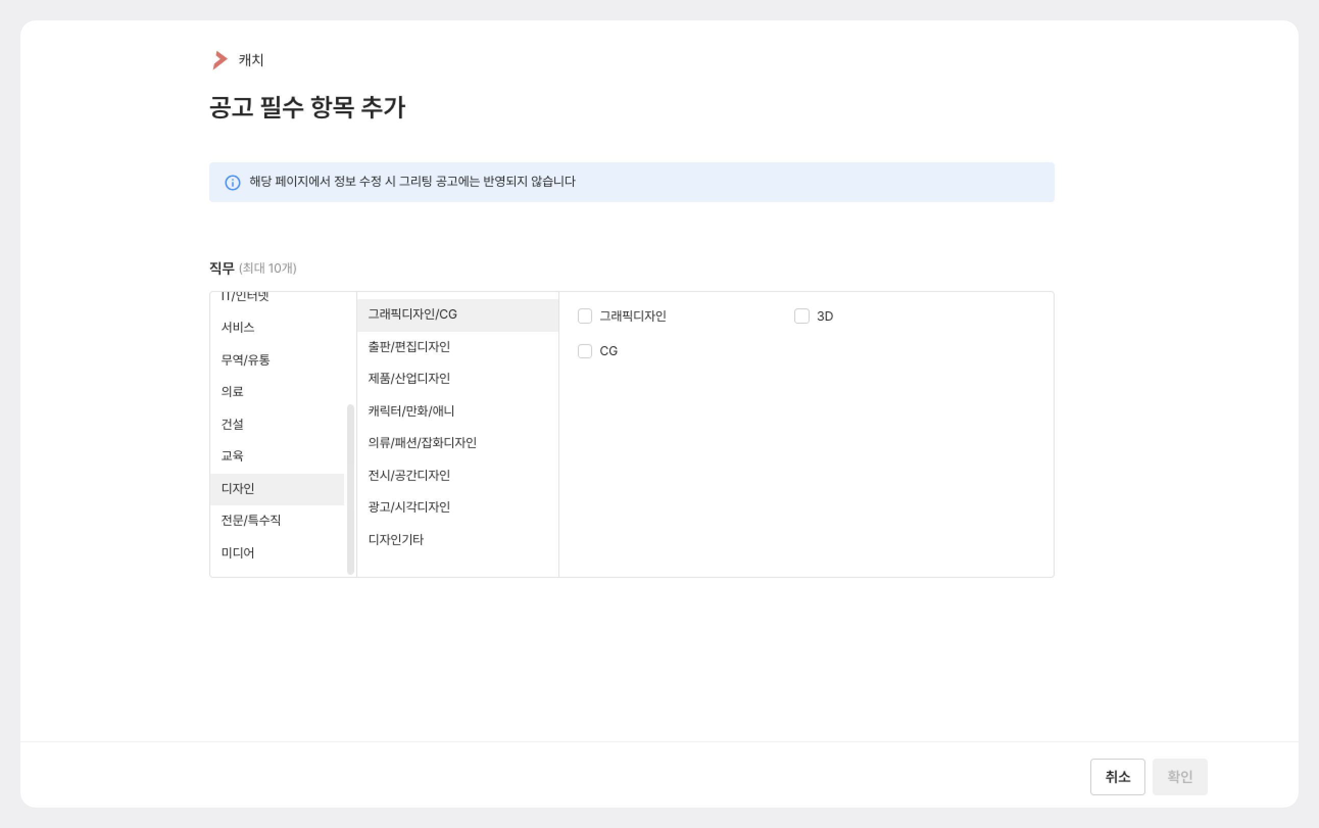 공고 연동 시 캐치 플랫폼 필수 항목인 직무를 선택하여 공고 연동을 완료합니다