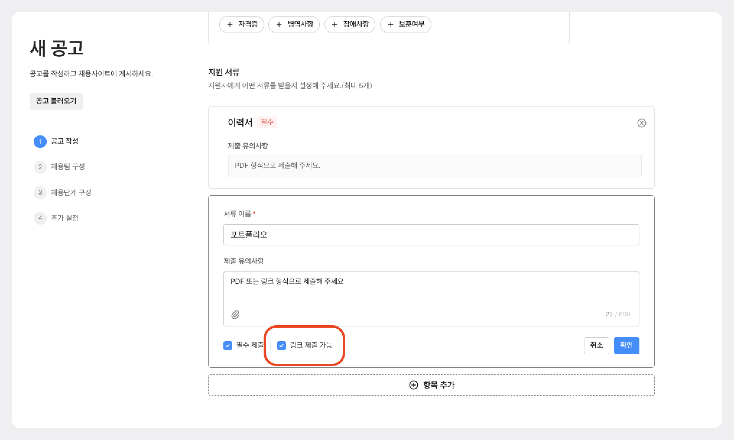 지원 서류 링크 제출 옵션은 [공고 생성/수정] → [지원 서류] 영역에서 설정할 수 있습니다