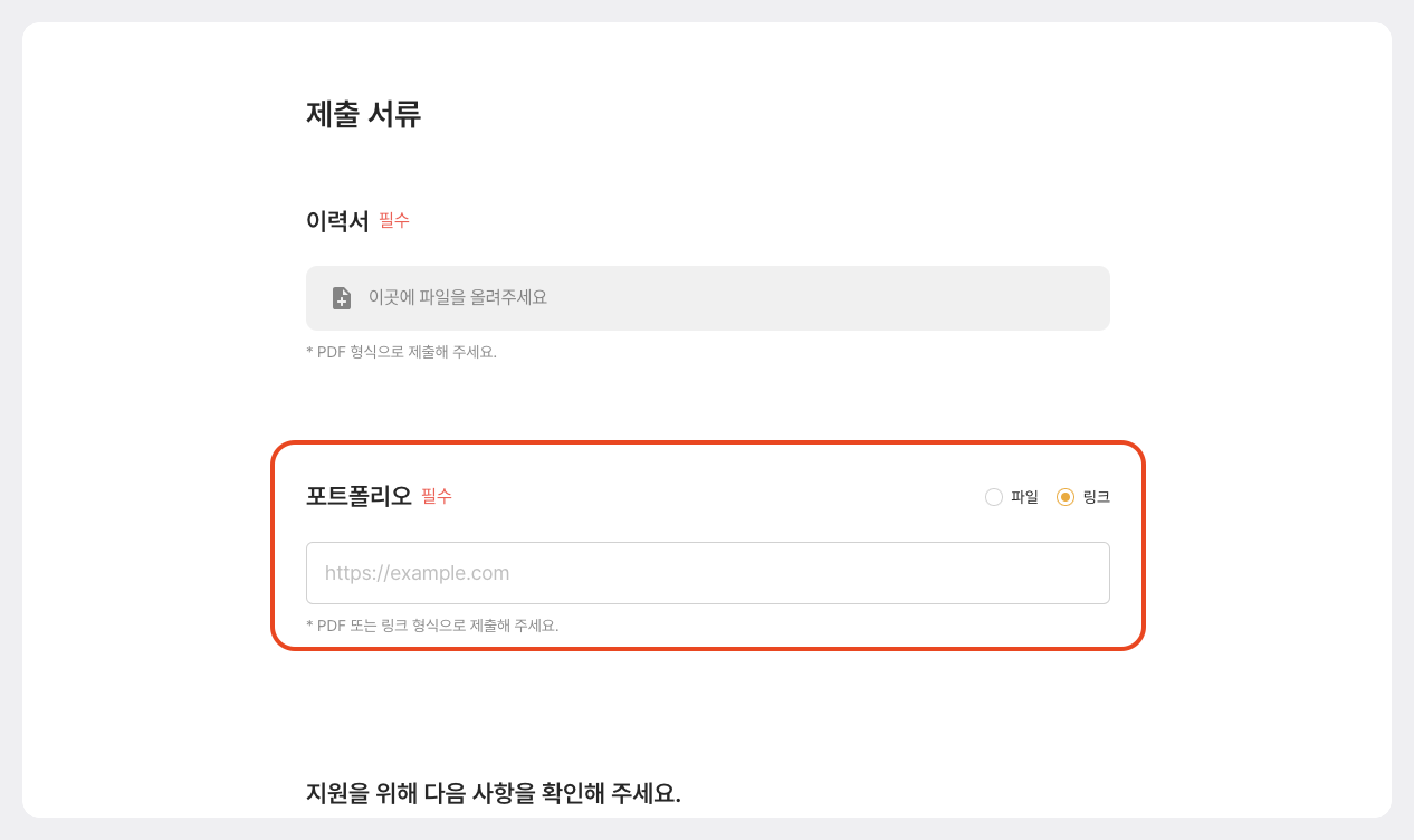 설정 시, 지원자는 지원 페이지에서 파일 또는 링크 옵션을 선택하여 지원 서류를 추가할 수 있습니다