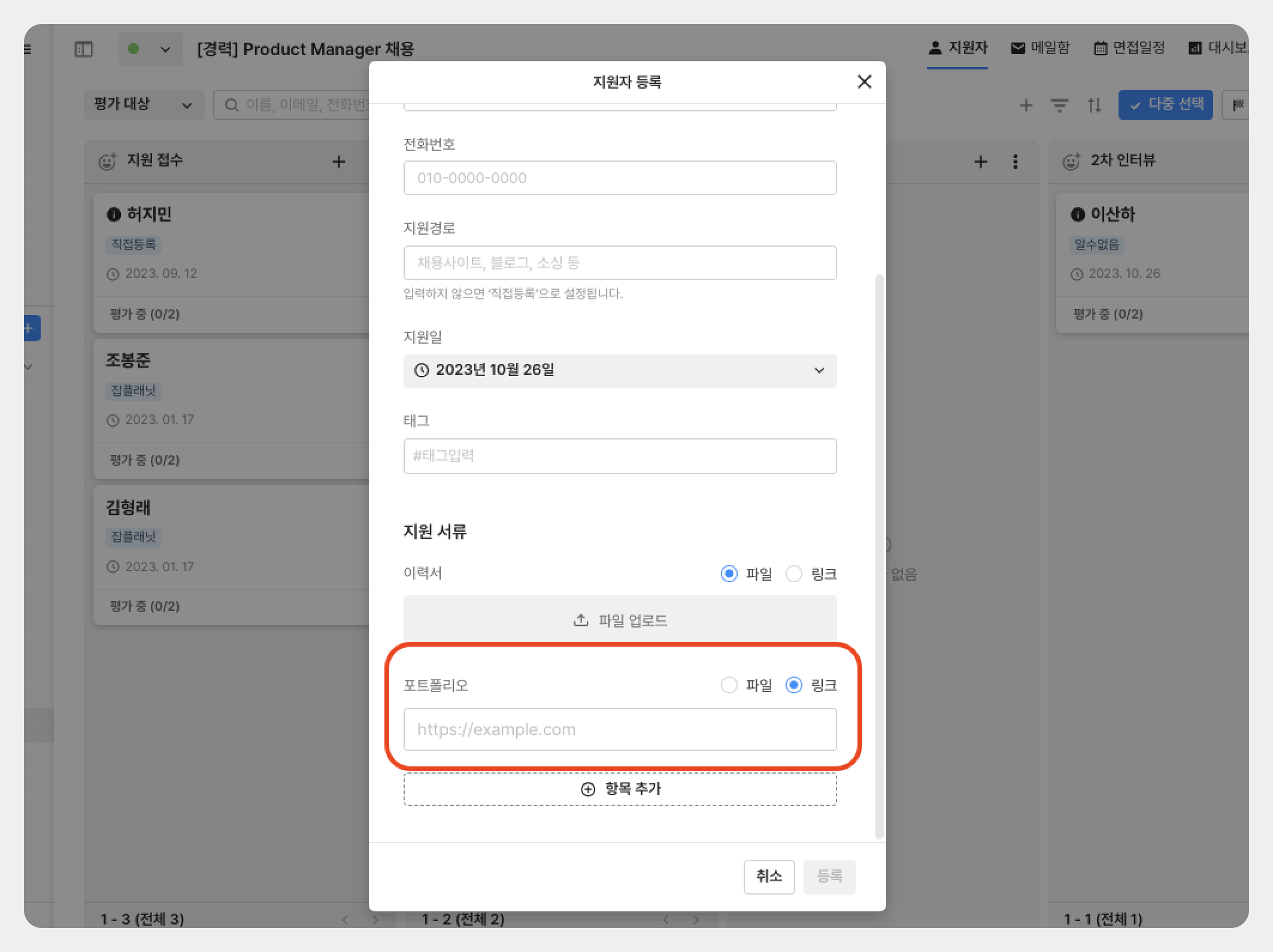 지원자 직접 등록, 지원 서류를 등록하는 경우에도 링크로 추가할 수 있습니다