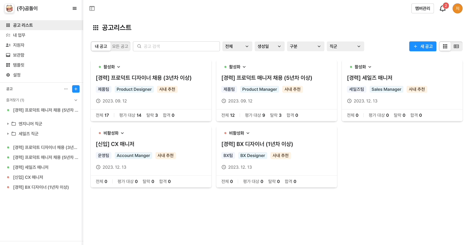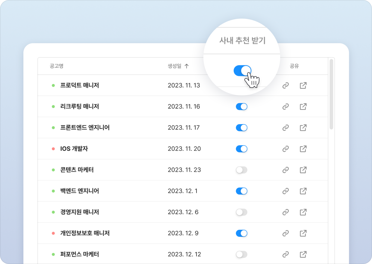 생성된 공고 중, 어떤 공고를 사내 추천으로 지원자를 받을 것인지를 설정할 수 있습니다.