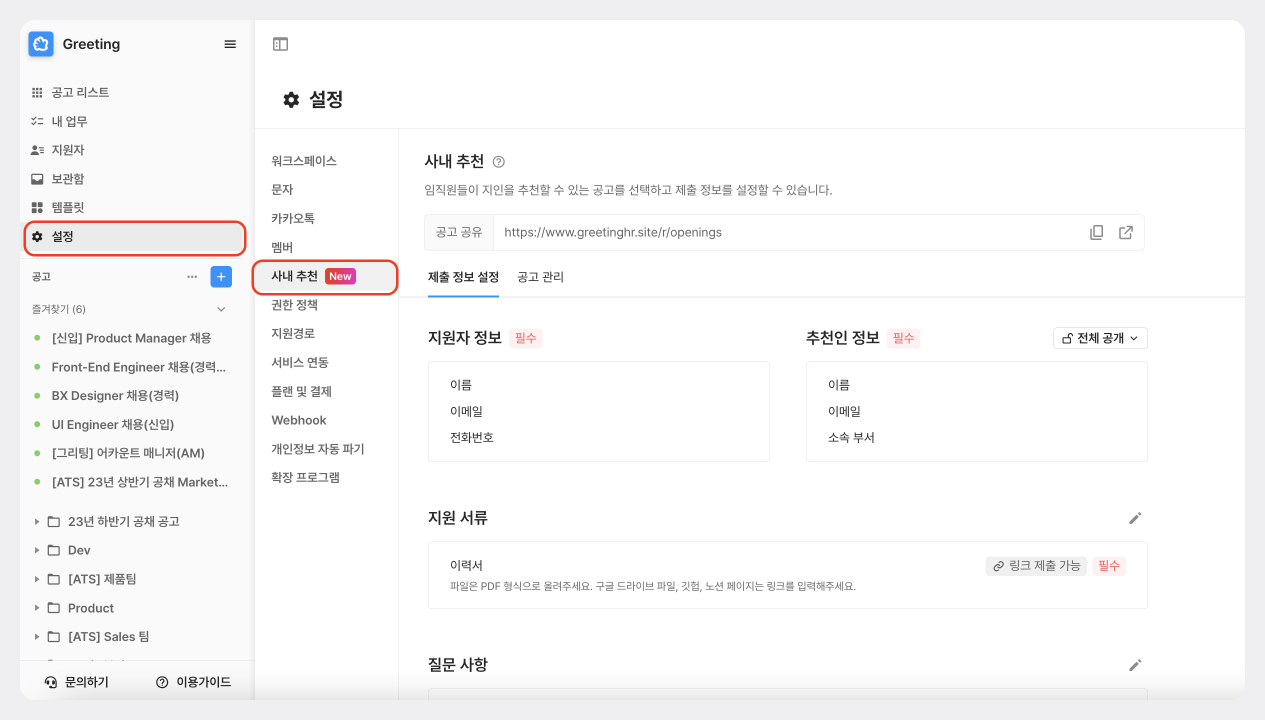 사내 추천 기능은 [설정] → [사내 추천]에서 이용할 수 있습니다.