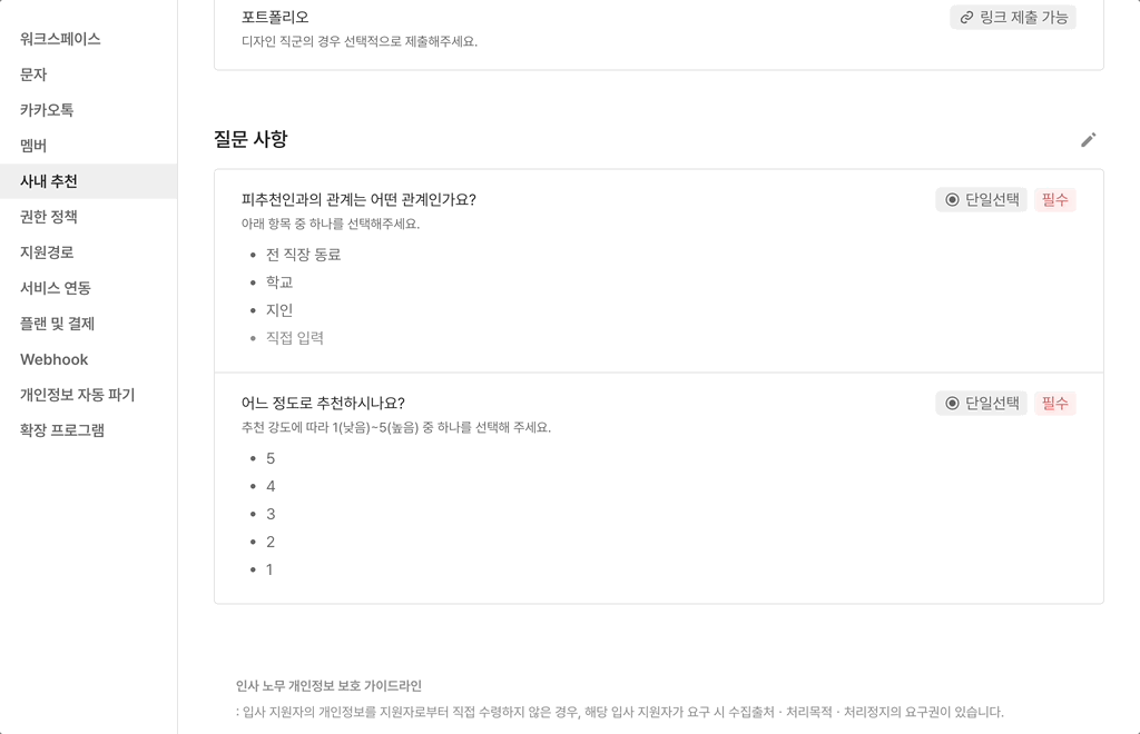추천인이 지원자 등록 시 함께 제출해야 하는 다양한 질문 항목을 자유롭게 구성할 수 있습니다.