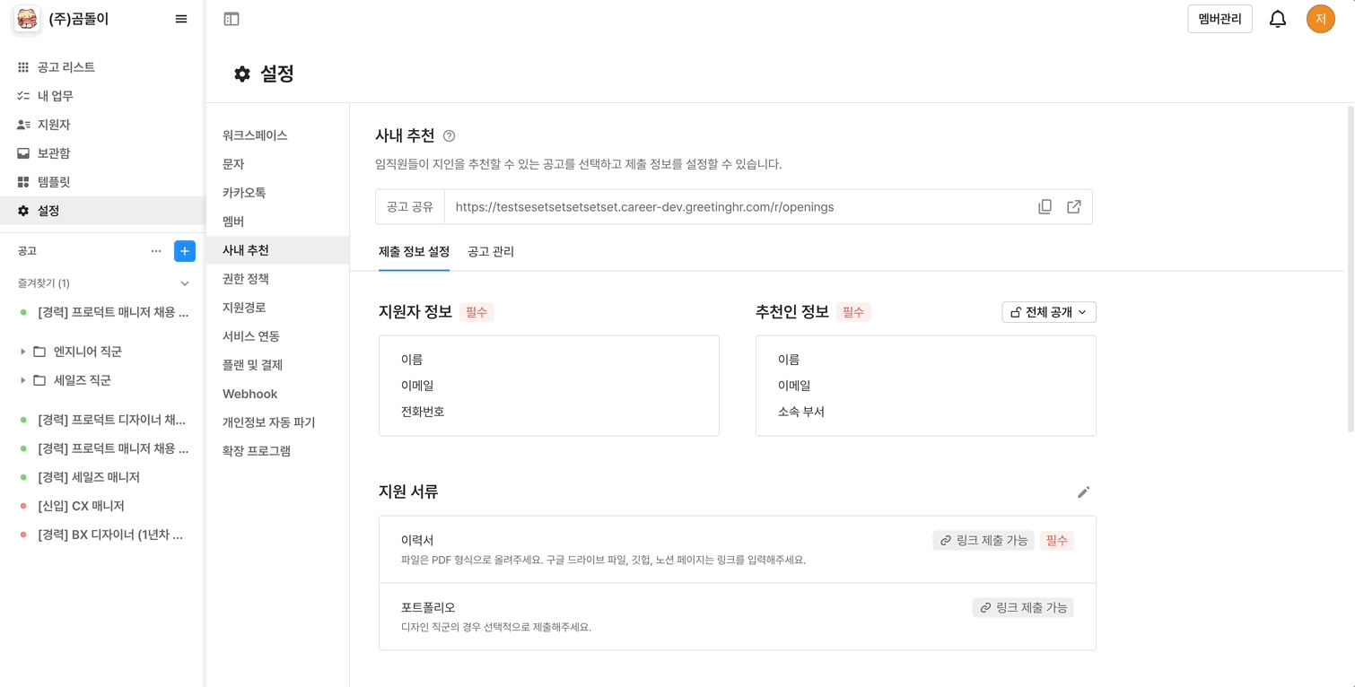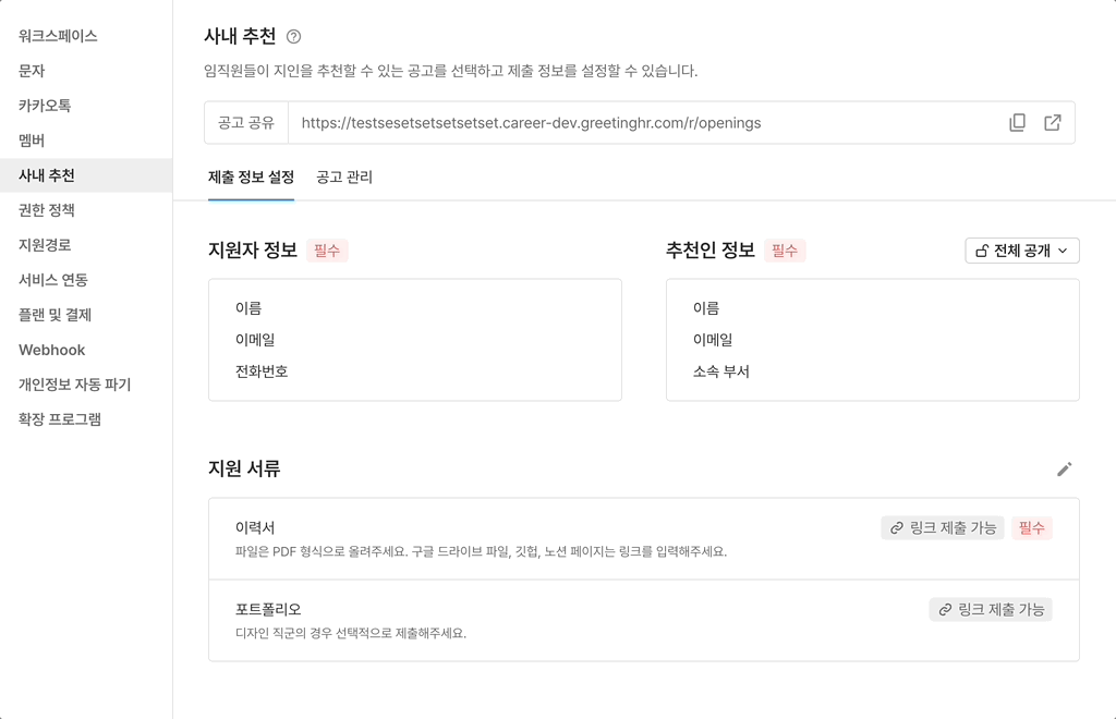 공고를 ‘비활성화’ 상태로 변경하고, 사내 추천 ‘받기’로 설정한 경우, 외부 공고 링크는 비활성화되지만 사내 추천용 공고 링크는 활성화되어요.
