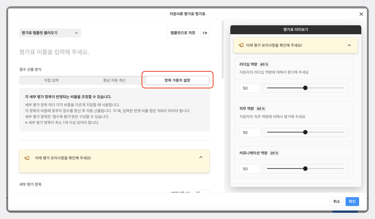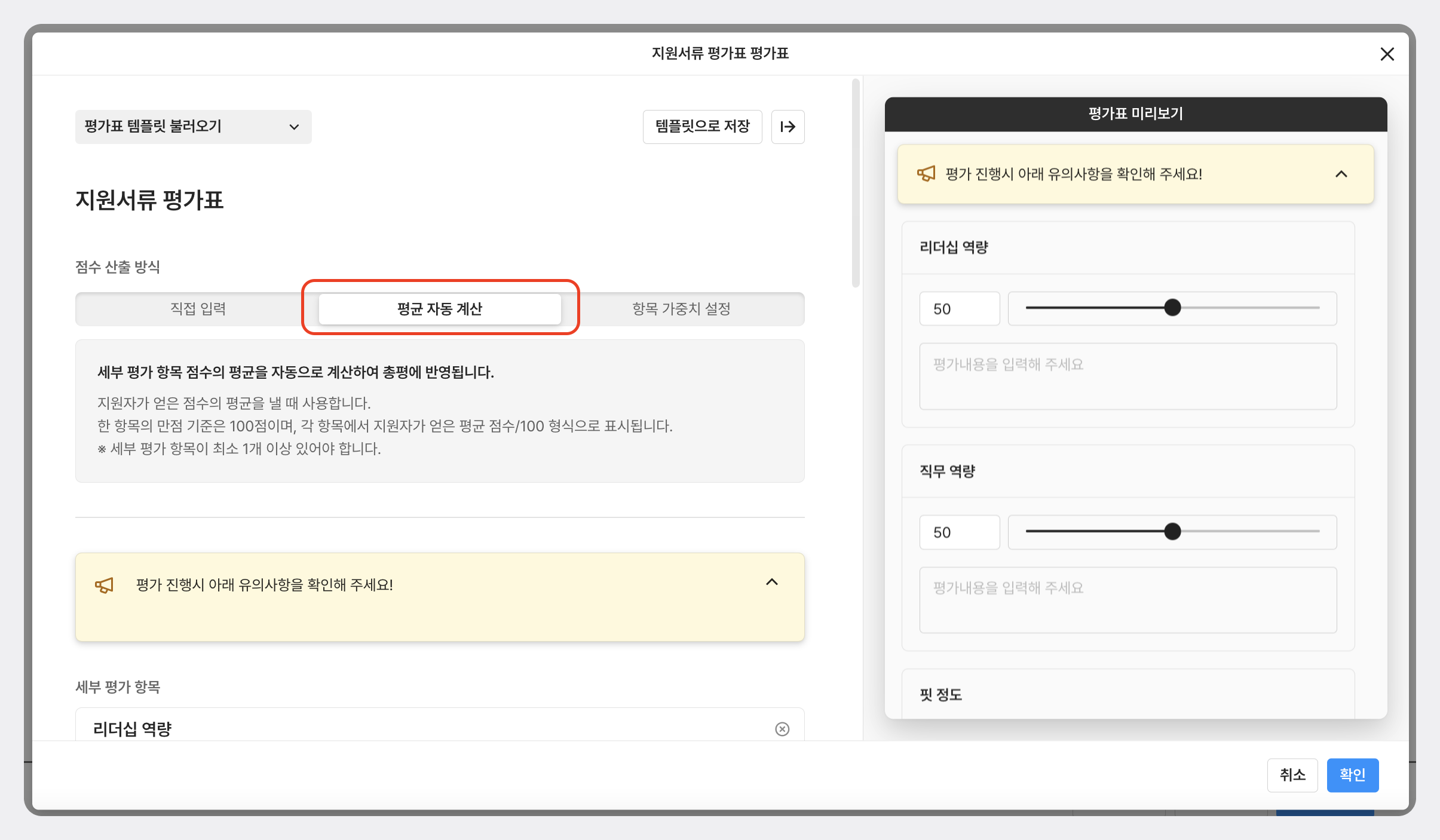 평가를 보다 체계화되게 구성하고 싶다면 평가표 개선을 이용해 보세요. 이제 총평 점수를 직접 입력하는 방식 외에도 평균 방식 또는 가중치 방식을 통해 세부 평가 항목의 다양한 조합으로 자동화하여 구성할 수 있습니다.