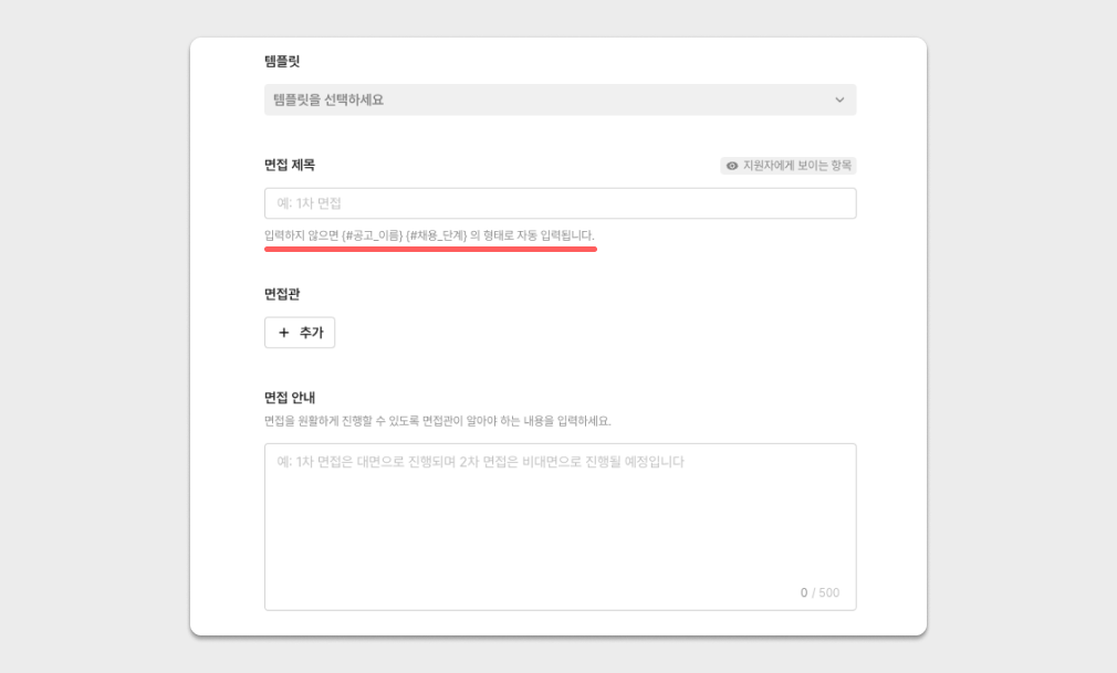 {#지원자 이름}{#공고 이름}{#채용단계}의 형태로 자동 입력됩니다.그룹 면접인 경우 면접 제목에 지원자 이름이 자동으로 입력되지 않습니다.