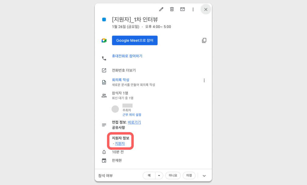 '면접 제목'을 입력할 시, 연동한 캘린더에 등록되는 일정의 이름에 함께 반영됩니다.