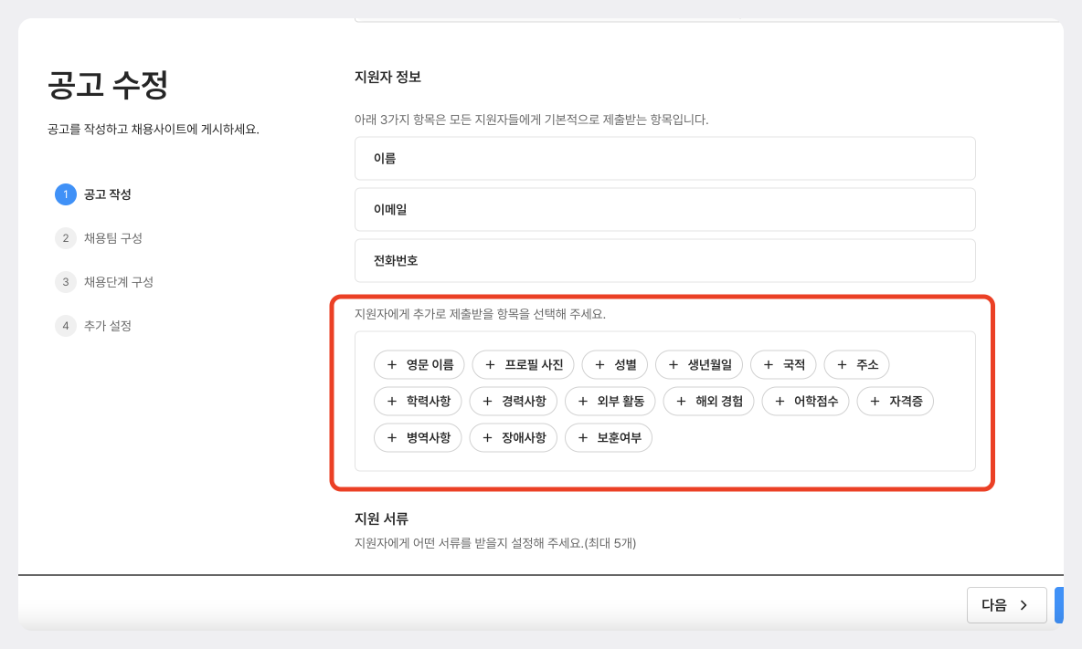 공고 생성/수정 하단 지원자 정보에서 지원자로부터 수합하고 싶은 항목을 클릭하여 추가할 수 있습니다.