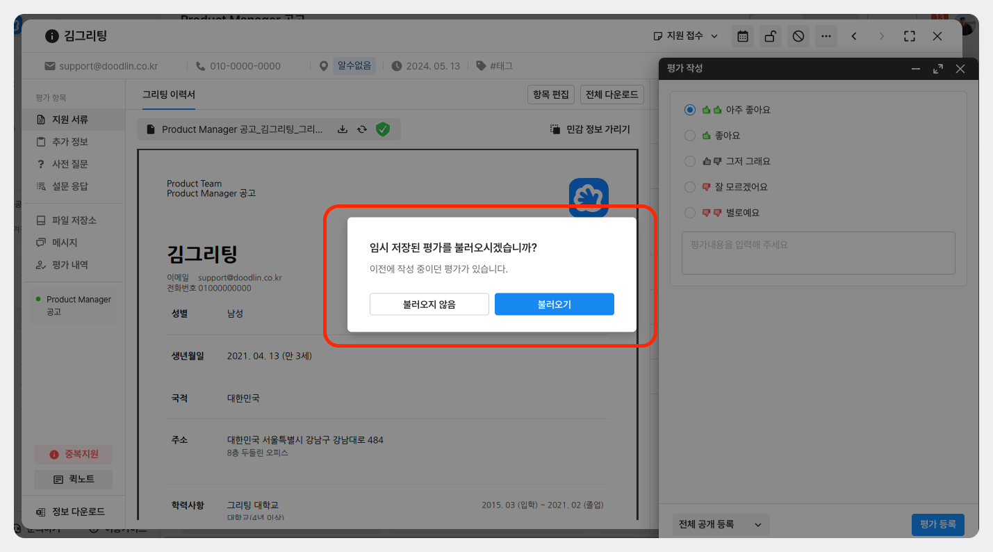 작성 중인 평가가 계속 유지될 수 있도록 평가 임시저장 기능을 추가했습니다. 이제 보다 편하게 평가를 진행해 보세요.