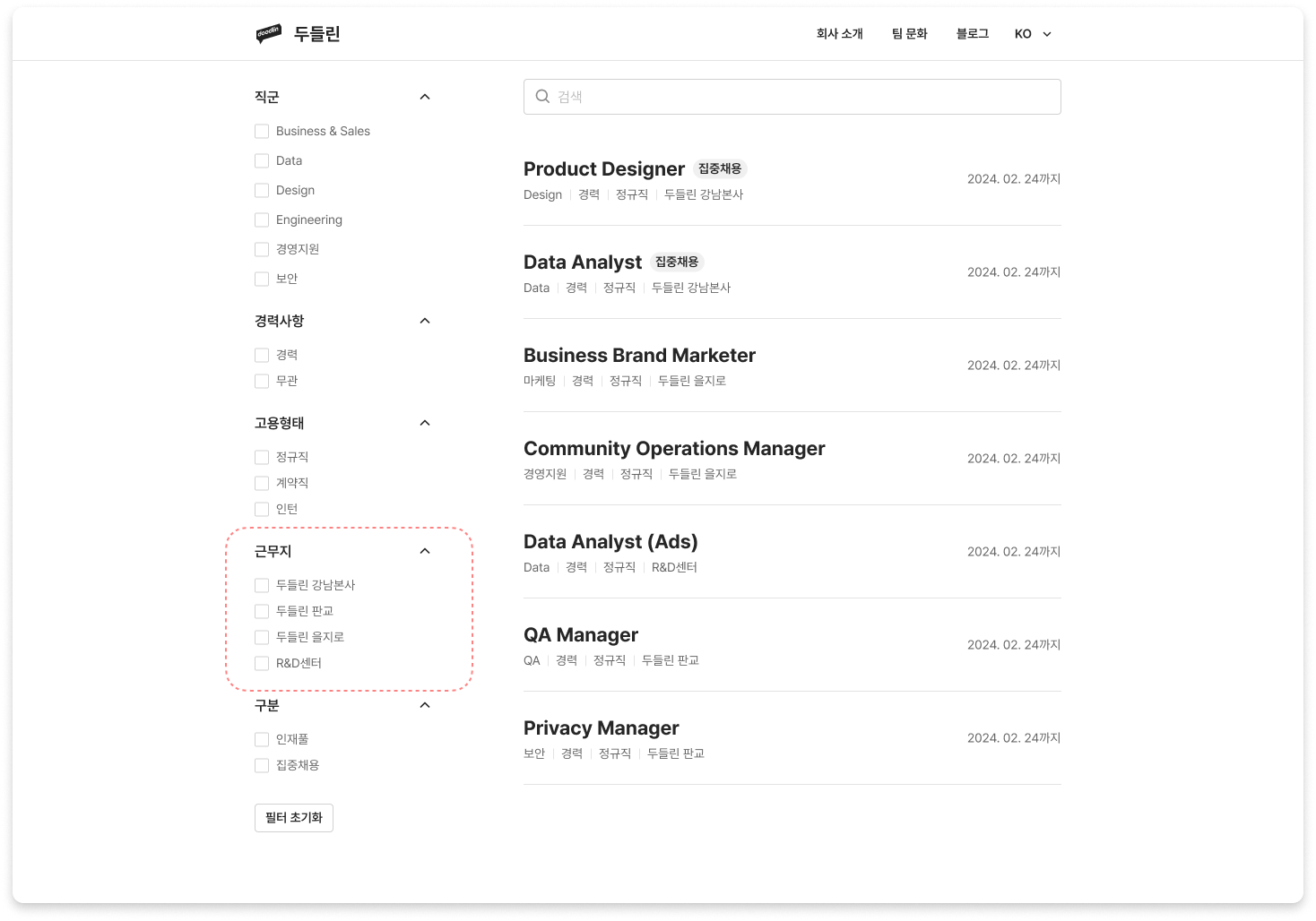 지원자채용 홈페이지에서 '근무지 이름'으로 공고를 필터링할 수 있습니다.