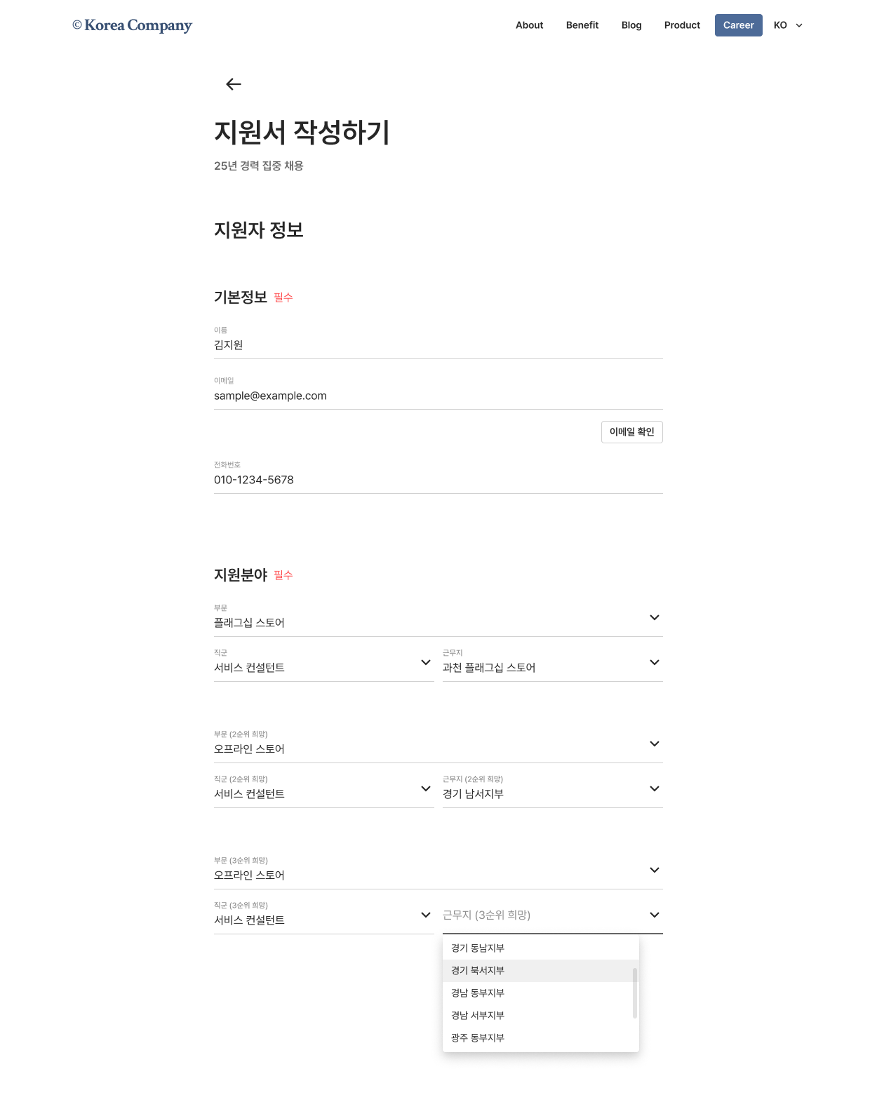 지원자어떤 근무지에 지원할지 직접 선택할 수 있습니다. (복수 모집분야로 설정된 공고에 지원하는 경우)