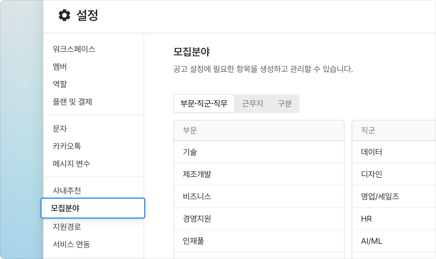 공고별로 설정하던 '모집분야' 정보를 워크스페이스 설정 메뉴에서 통합 관리할 수 있습니다.