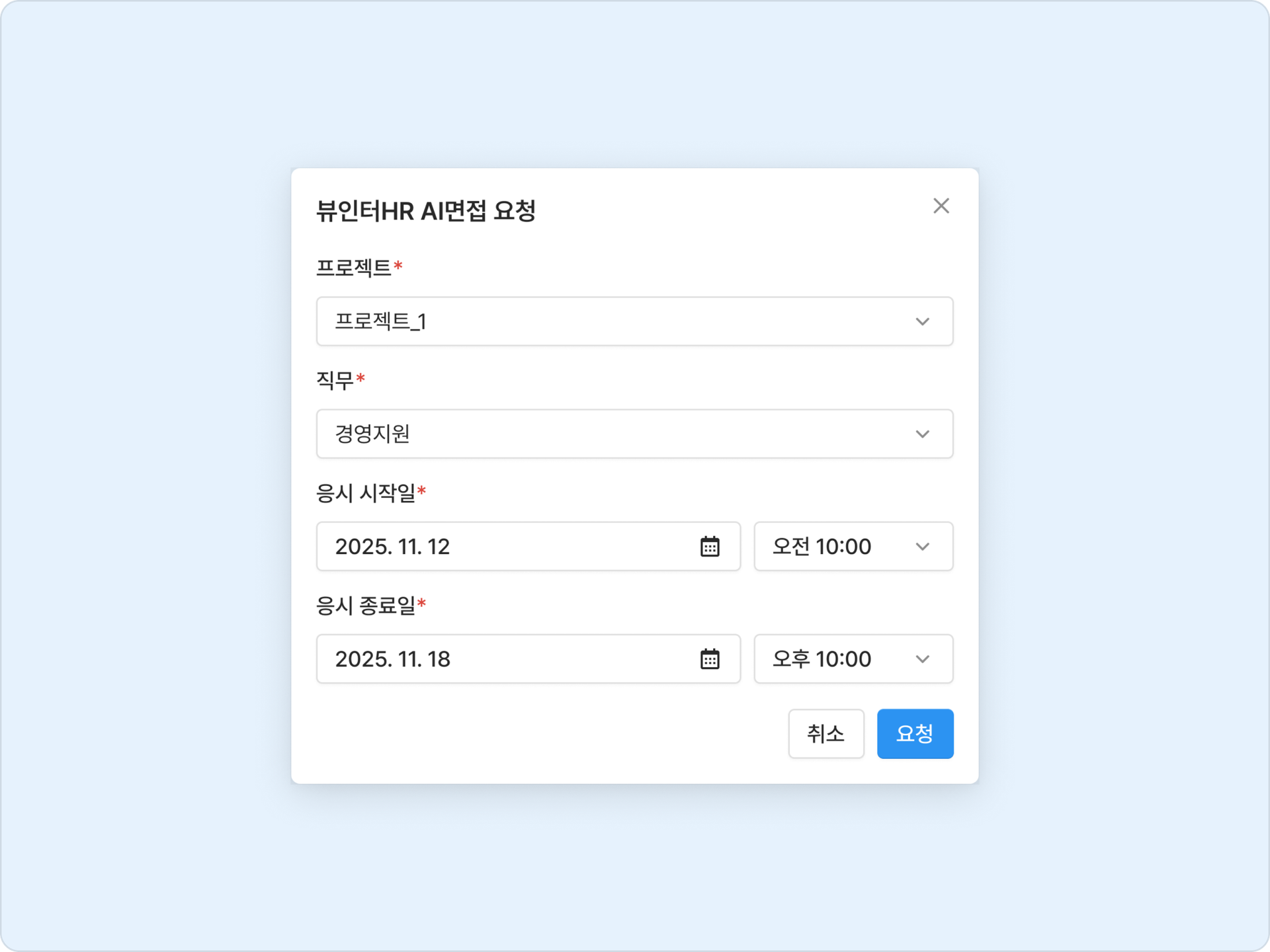 응시 기간 선택: AI면접을 응시할 '시작일시'와 '종료일시'를 설정합니다. 설정한 기간 동안 지원자가 AI면접에 응시할 수 있습니다.