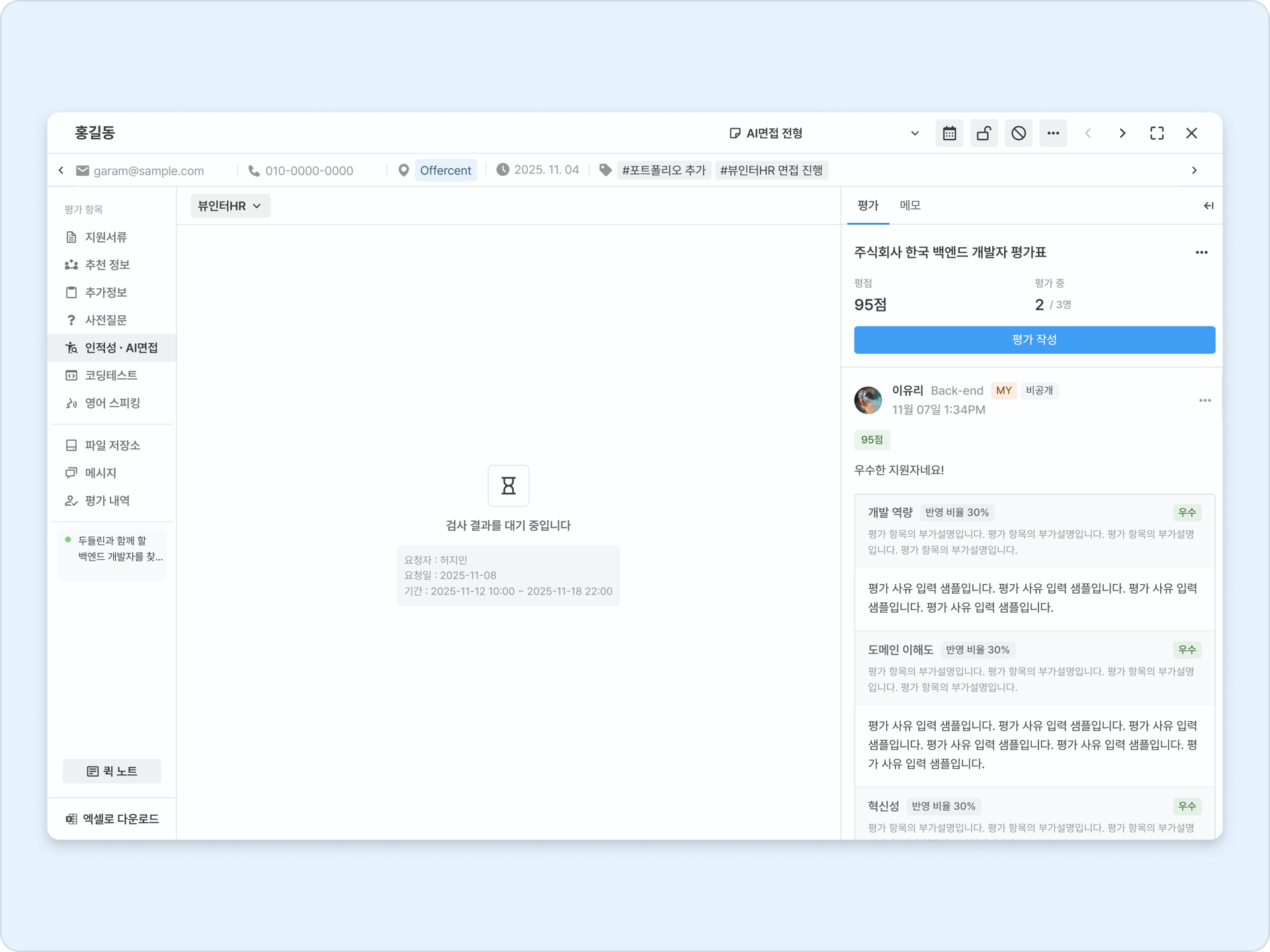 지원자 상세 페이지에서 AI면접 요청 내역을 확인할 수 있습니다.